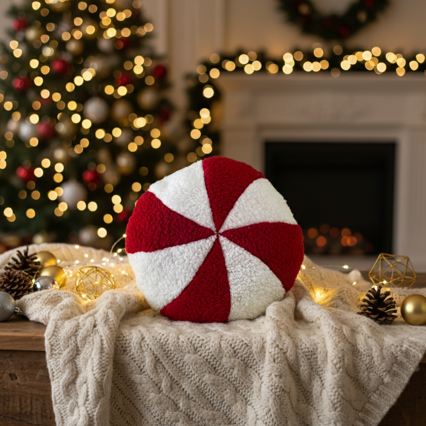 El Cojín Caramelo Redondo suma un toque festivo y acogedor. Su tacto afelpado lo hace cómodo y decorativo para sillones, camas o rincones navideños.