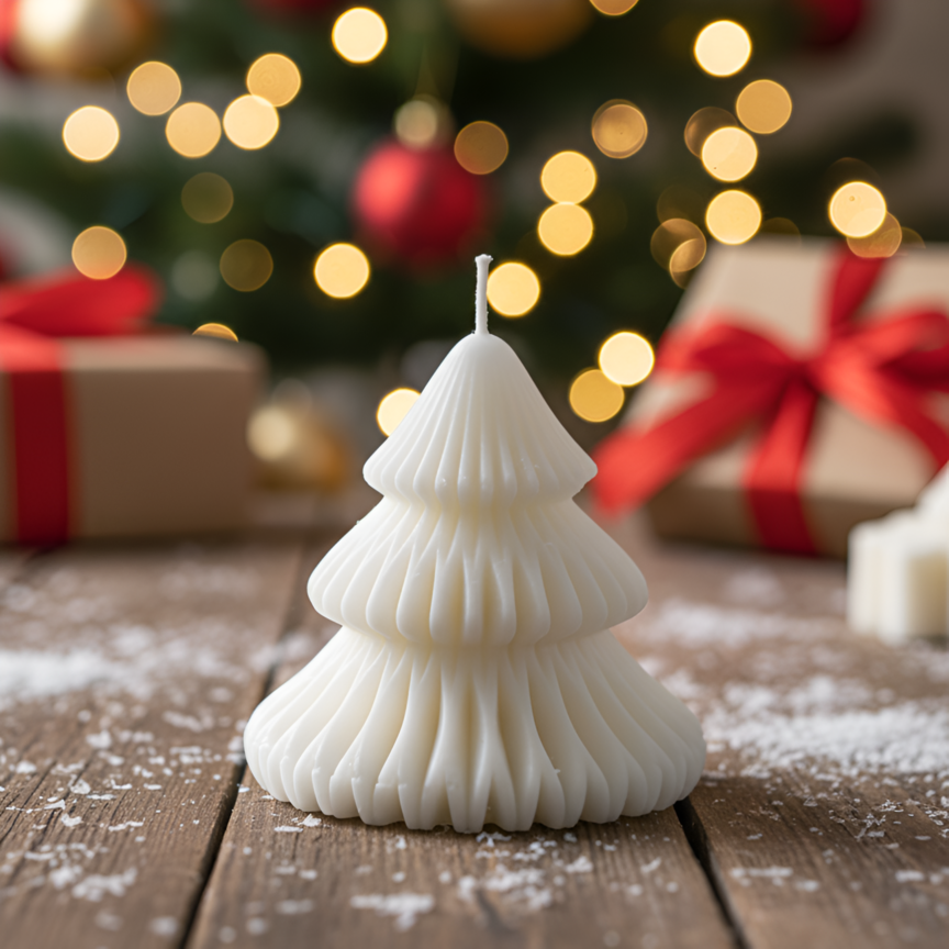 Vela Árbol Navideño moldeada artesanalmente con ceras vegetales de alta calidad. Su forma de pino con textura ondulada aporta elegancia y calidez, perfecta para decorar espacios festivos o regalar en temporada. Combustión limpia y acabado natural.