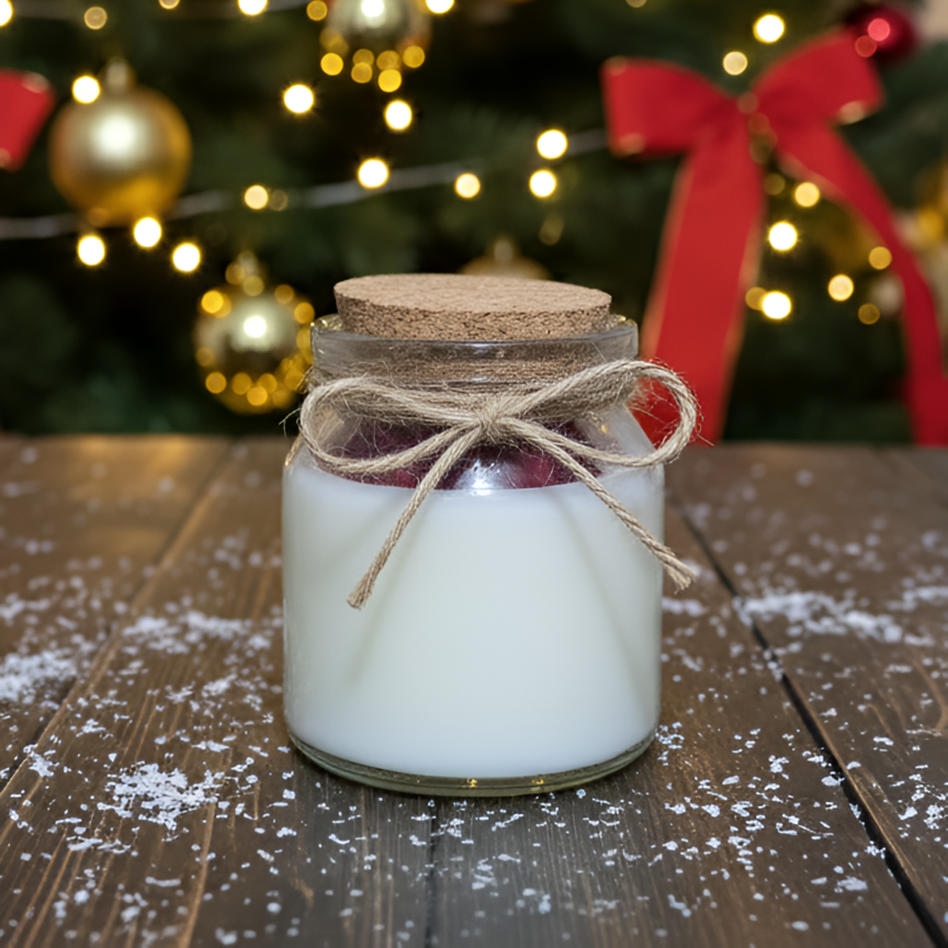 Vela en tarro de vidrio con tapa de corcho, elaborada artesanalmente con ceras vegetales. Su lazo de yute y tono marfil aportan un toque natural y festivo, ideal para decorar o regalar. Combustión limpia y aroma suave que acompaña sin saturar.